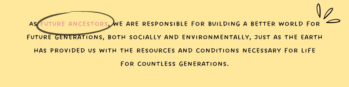 We are stewards of the earth and must make it livable for future generations. Herein lies the very definition of sustainability — meeting our needs today without compromising future generations’ ability to make their own decisions. As future ancestors, we are responsible for building a better world for future generations, both socially and environmentally, just as the Earth has provided us with the resources and conditions necessary for life for countless generations. Today, we stand on the precipice of making better decisions – taking steps to reduce our environmental impact and inducing a cultural shift towards one where care about each other and the world around us.