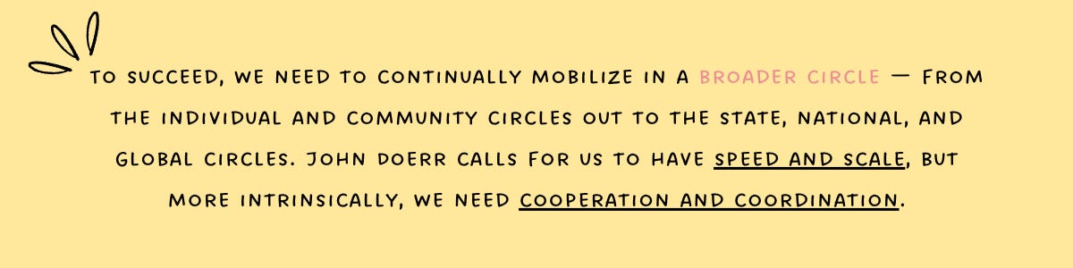 With eight billion people sharing the same world and facing a common climate crisis, the time for action is now. Climate change is immediately upon us, and we are called to make drastic changes to our lives. Tackling this crisis is not simply a matter of developing technological solutions and hoping we get there, but also demanding systemic change in every aspect of our lives. From the individual level to communities, organizations, and governmental levels. We know exactly how to reduce emissions, but our complex political systems make it really difficult. We can make a difference by holding our politicians and decision-makers to a higher standard. No longer is it enough that we vote for the candidate who has a climate plan or even just believes in climate science, but we need candidates who see the bigger picture and aren’t afraid to take the steps we need to achieve the most ambitious goals. We need to move from a place of ignorance and tokenism to a place of genuine citizen participation — a form of collaborative governance. For this to work, we need to be actively engaged with the world around us. Understandably, we all have so much going on in our everyday lives, but as the saying goes, “the days move slowly, but the years fly fast.” Day to day and year to year, climate change impacts our transboundary world as we know it. To succeed, we need to continually mobilize in a broader circle — from the individual and community circles out to the state, national, and global circles. John Doerr calls for us to have speed and scale, but more intrinsically, we need cooperation and coordination.